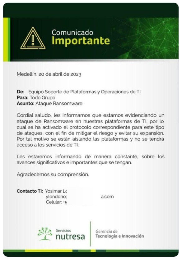 Un grupo de ciberdelincuentes atacó los servidores del grupo Nutresa, que emitió un comunicado interno explicando a sus colaboradores que “se identificó un evento de posible ransomware y hasta el momento no se ha evidenciado un compromiso a la integridad de los datos de la Organización ni de la información de sus clientes, proveedores, consumidores y demás grupos relacionados”.