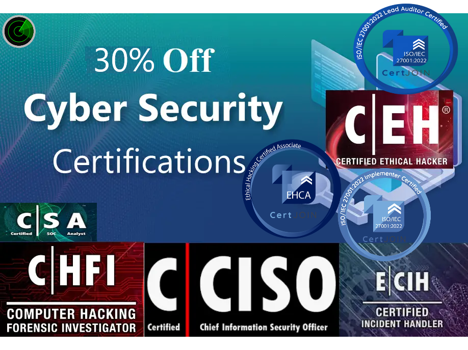 EC-Council y Certjoin como: CEH, CHFI, CTIA, CND, CCISO, EHCA, EHCE, ISO 27001, ISO 27032. Hasta Noviembre 30